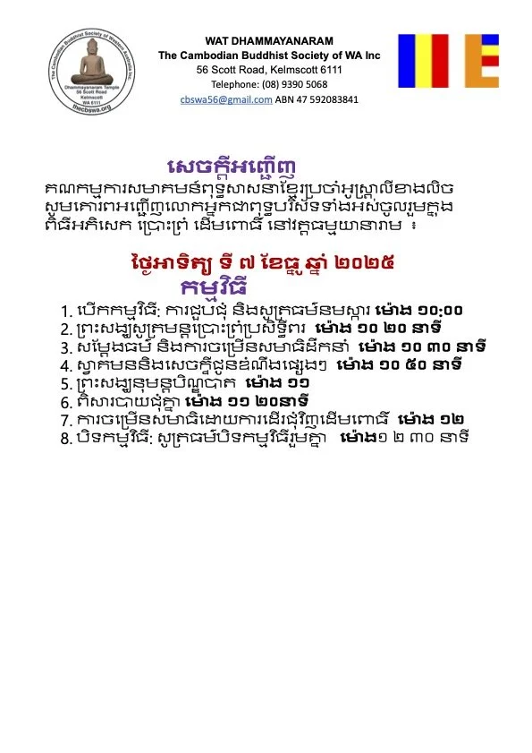 ពិធីបុណ្យចូលព្រះវស្សា ពុទ្ធិក សមាគមខ្មែរប្រទទ្សអូស្រ្តា លីរដ្ខខាងលិច សូមគោរពអព្ជើាញ ឧបាសក ឧបាសិកាជាពុទ្ធបរិសទ័ ទាំងឡាយមកចូលរួមកុ្នង ពិធីបុណ្យចូលព្រះ វស្សានៅវត្រាតធម្មយានារាម តាមកម្មវិធី ខាងក្រោមនេះ ។